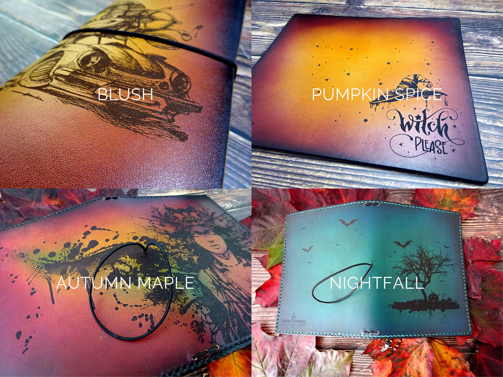 We have a few colorways listed, but other color combinations are possible. All airbrushing is done by hand so no two notebooks are exactly the same. The same goes for the paint accents.