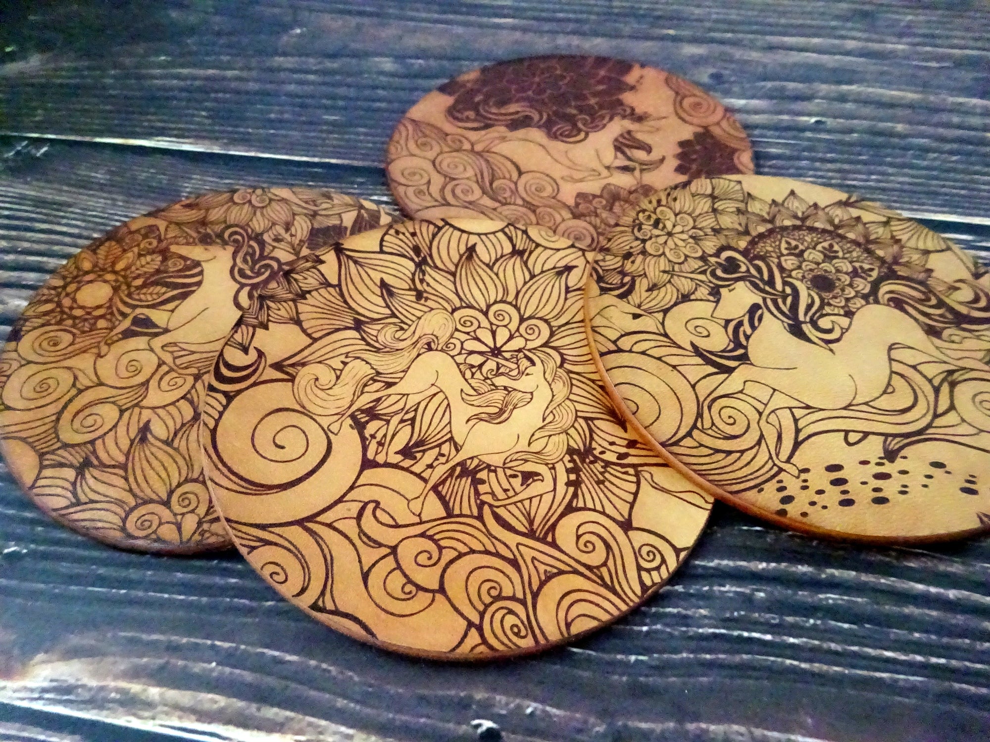 - Leather Coaster with engraved Unicorn design.