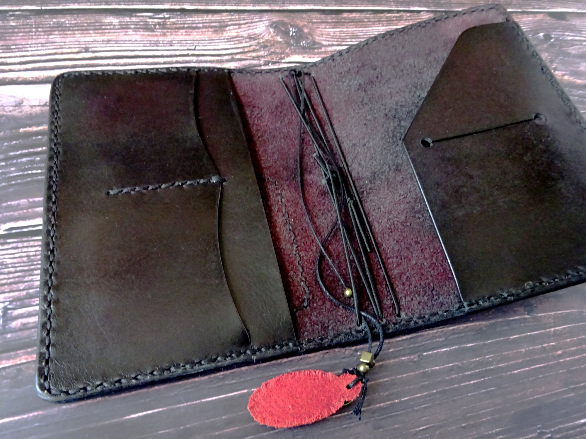 This showcase notebook is black with a hint of red. Hand glazed and embellished with 3 leather travel patches. Overall black stitching with red accent thread on 2 patches.